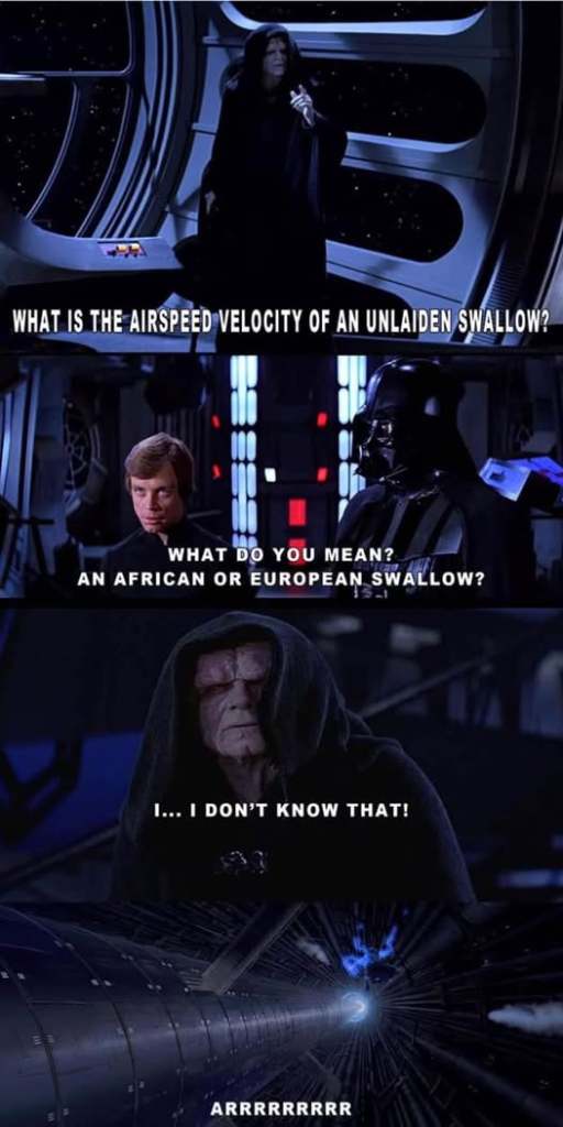 “What is the airspeed velocity of an unladen swallow?” ALWAYS pops out of my mouth.